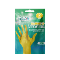 2 pairs of household latex rubber gloves. Size: medium. Non slip grip, unlined, yellow colour. Packed in a full colour sealed film bag.