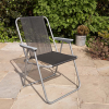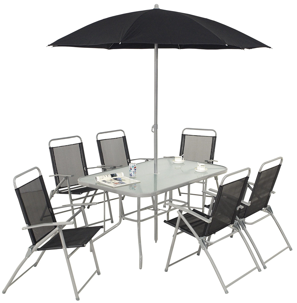 8 piece garden patio furniture set. Comprises 6 folding black textile and silver grey, powder coated steel chairs, 120cmx70cm rectangular table with toughened glass top and 180cm diameter black parasol.