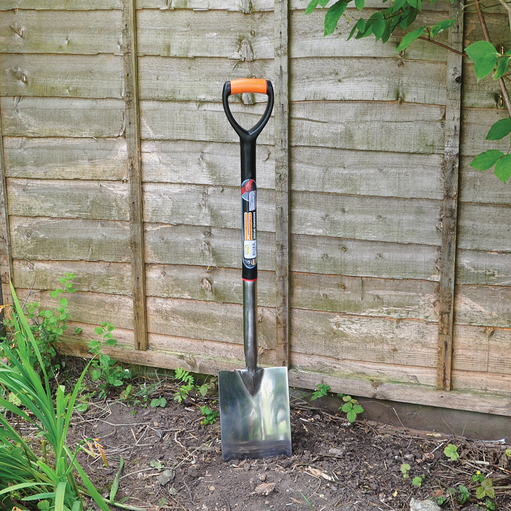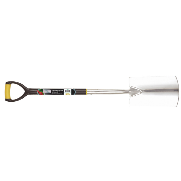 Pro Platinum stainless steel digging spade suitable for professional use. D shaped handle. Complete with full colour label.